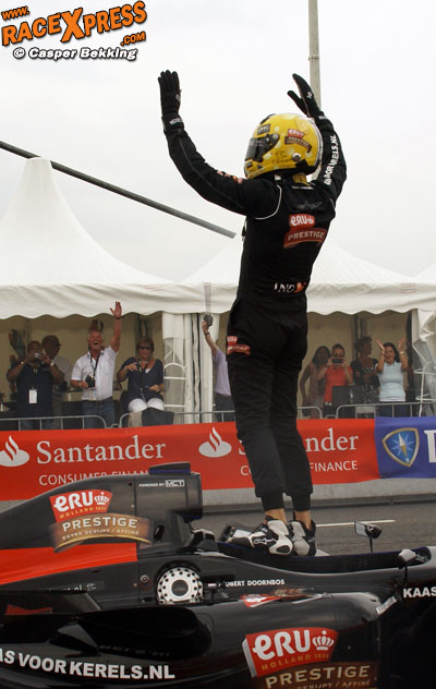 ROTTERDAM - Robert Doornbos heeft in zijn thuisstad voor een daverende show gezorgd tijdens de zevende editie van Bavaria City Racing. De oud F1-coureur gaf een spetterende demonstratie weg in de 750 pk sterke Superleague-bolide. Tussen de rookwolken door maakte RaceXpress onderstaande foto's/